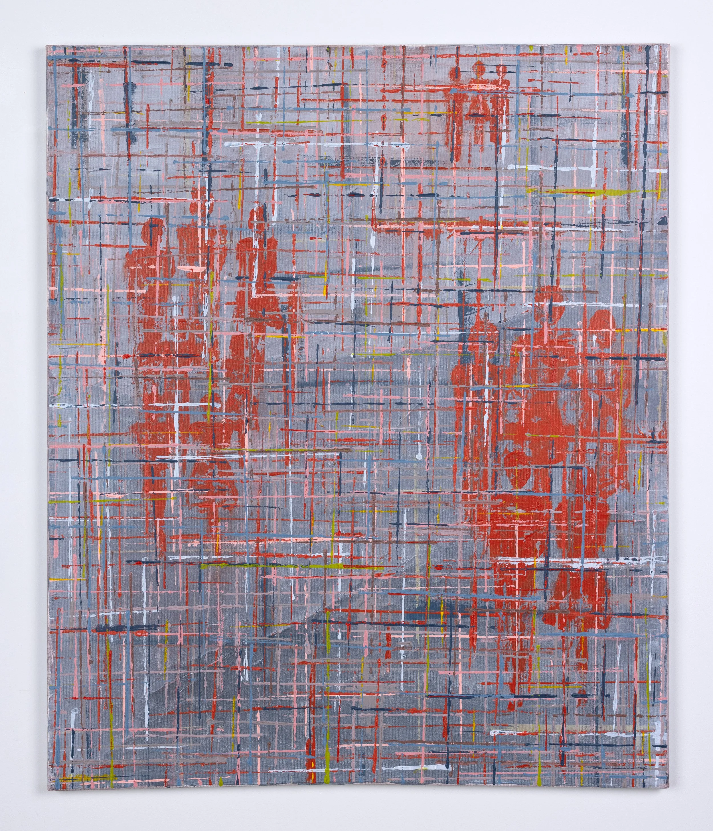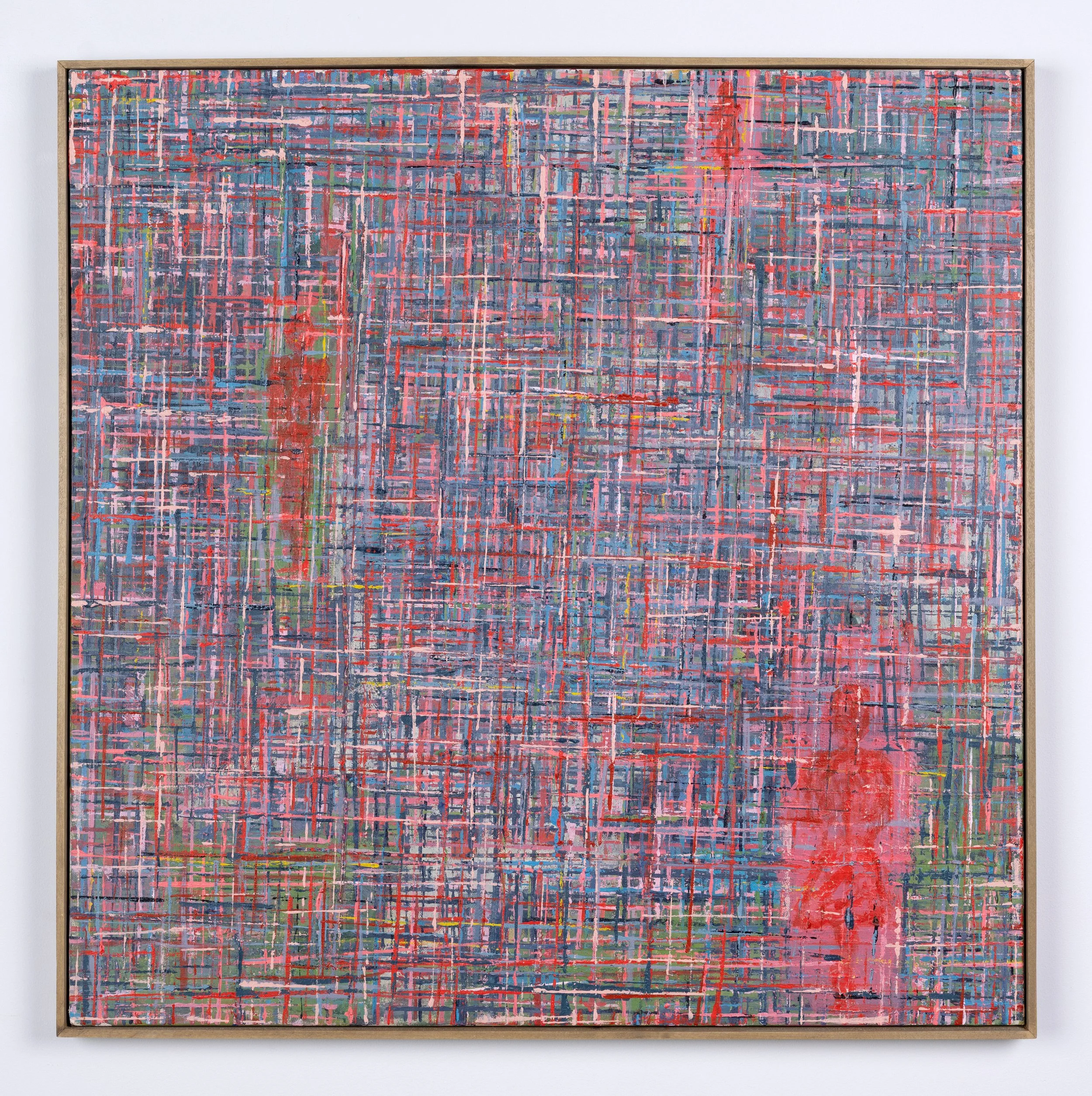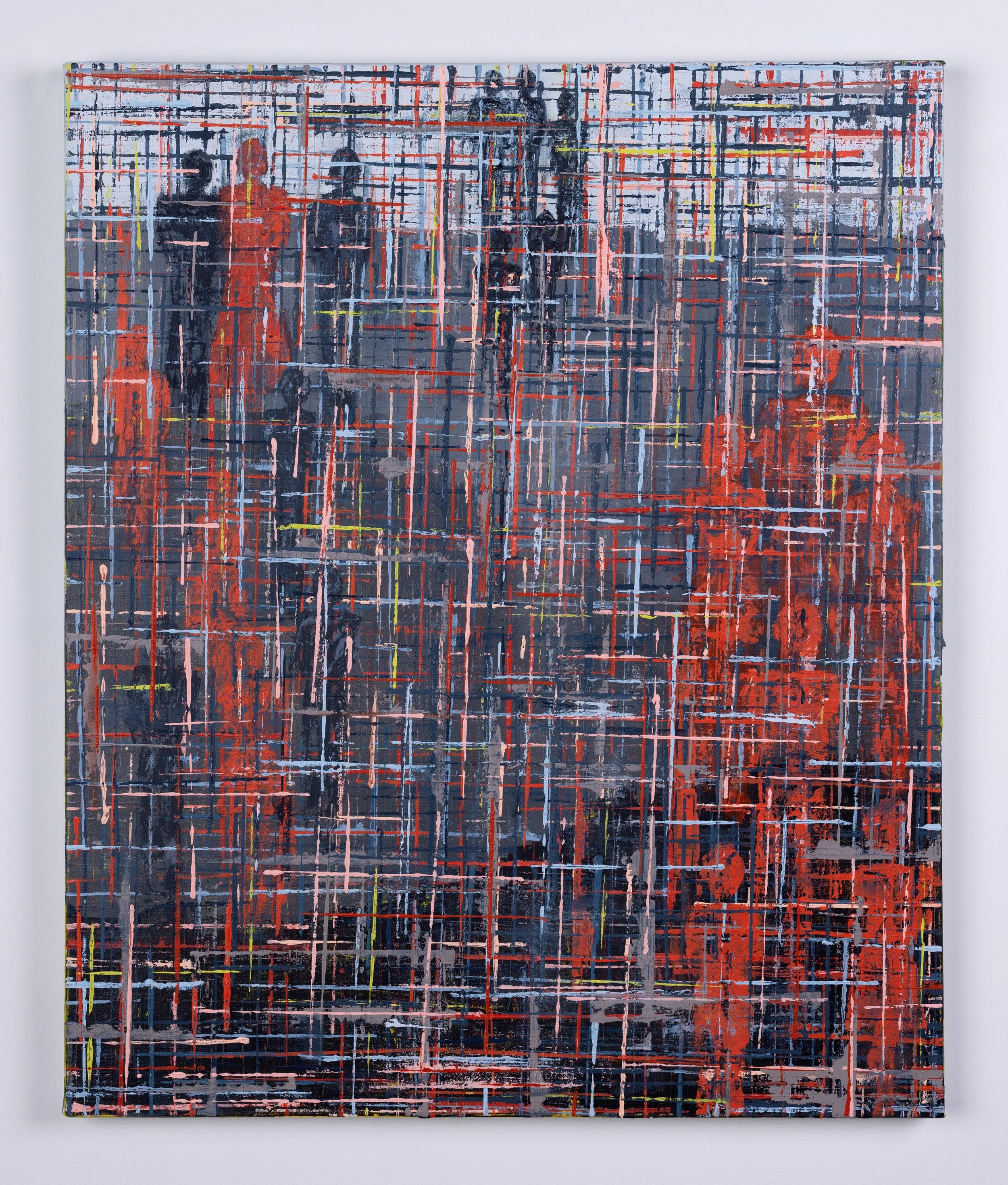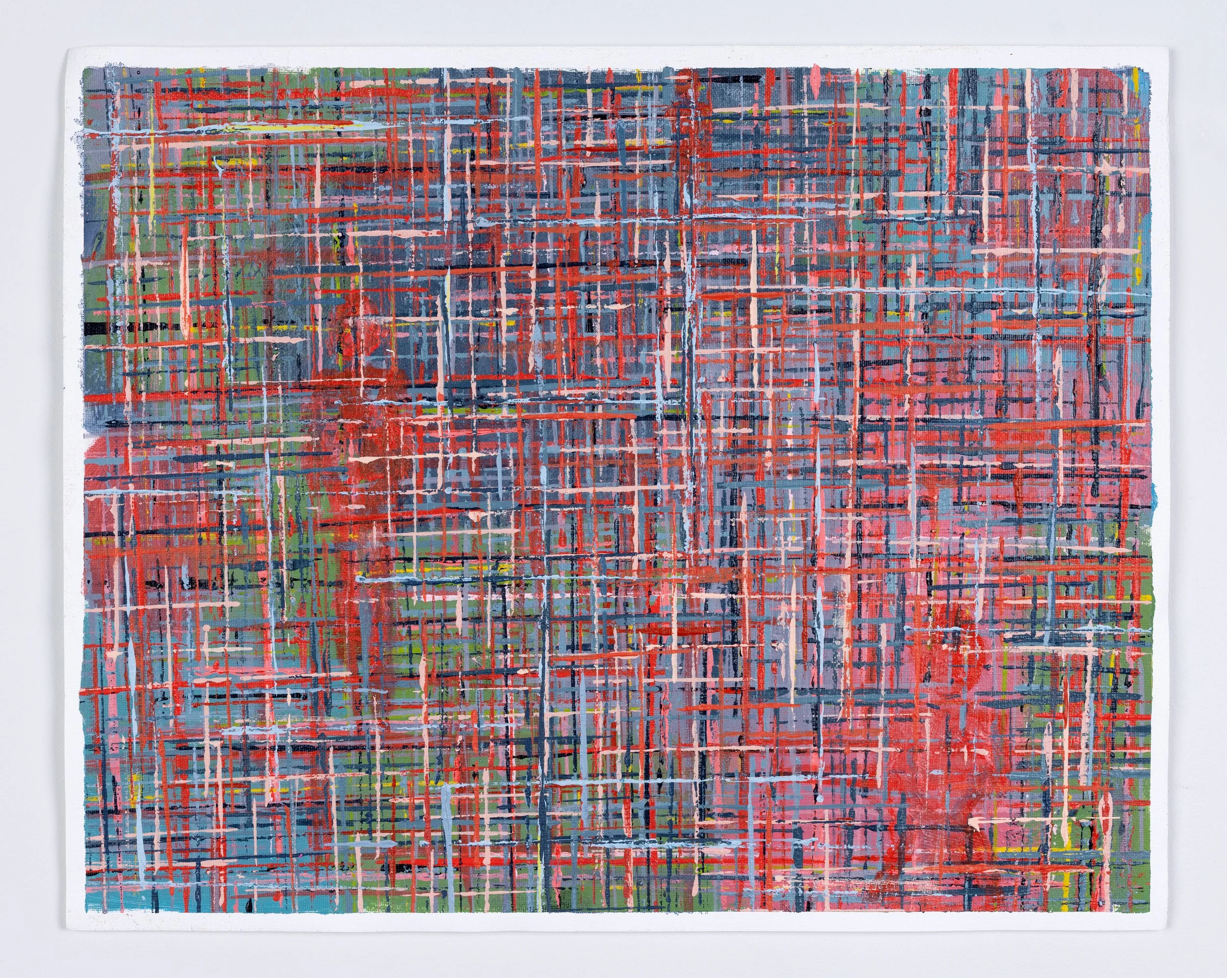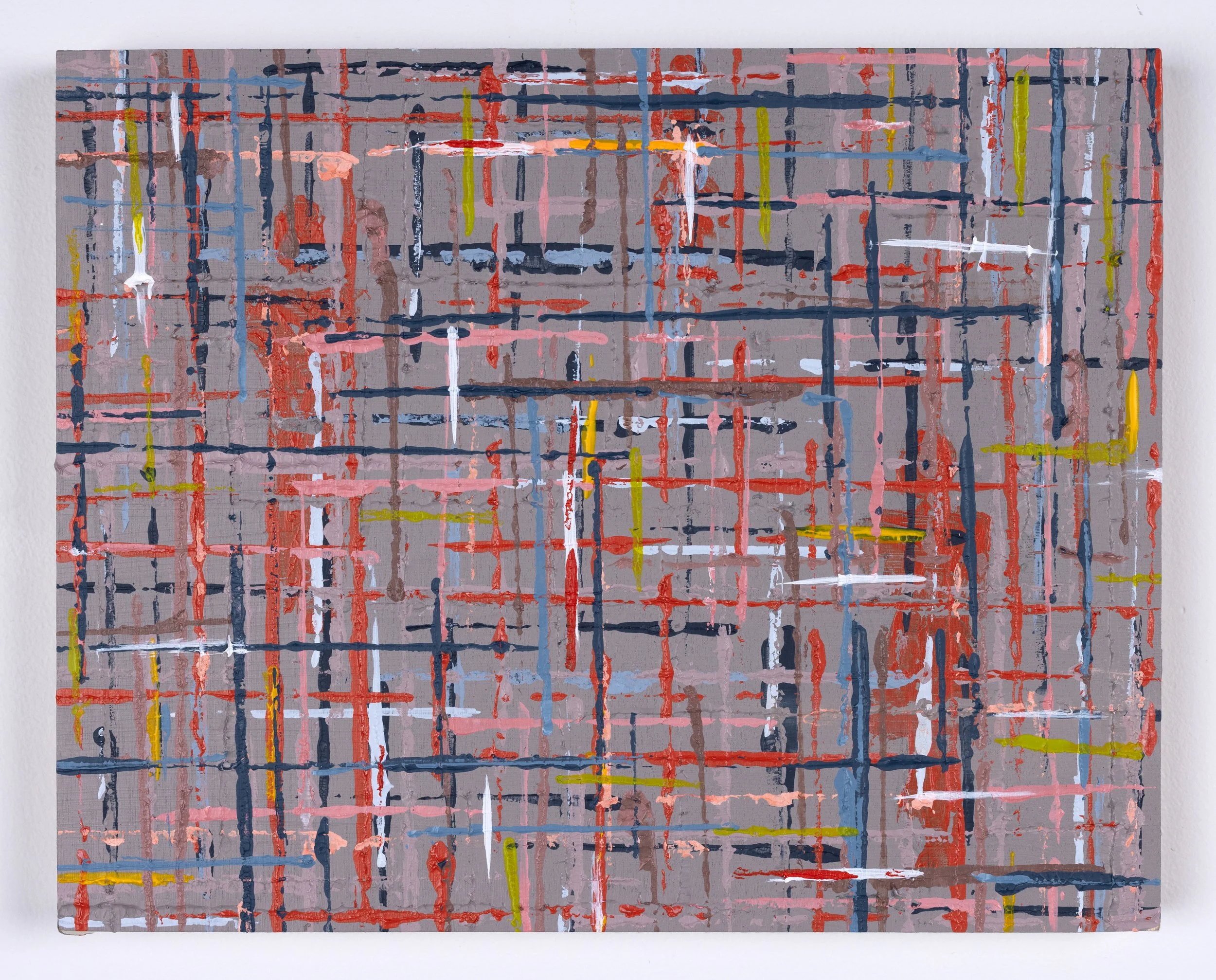 The ideas, experiences, and stories bound within a knitted piece, a scarf, are the subject of this work. The yarn itself has an origin story, and the act of knitting marks the passage of time. As I work on and wear a piece, my experiences are knitted into the fabric and are intertwined with the yarn’s own story. The knitted piece is a vessel, holding stories and experiences, for a specific period of time, for later introspection. The fibers link ideas and experiences I continue to explore on canvas.